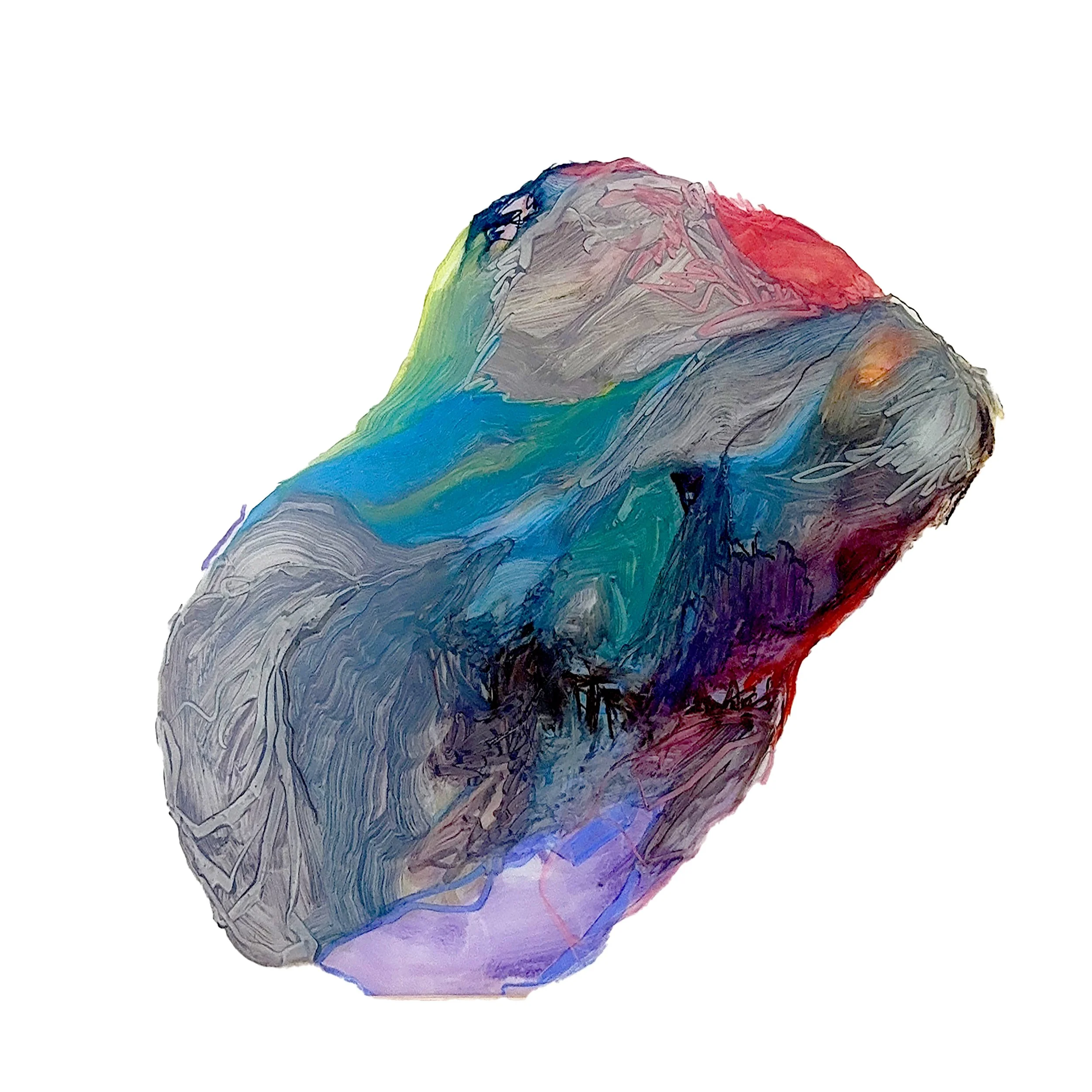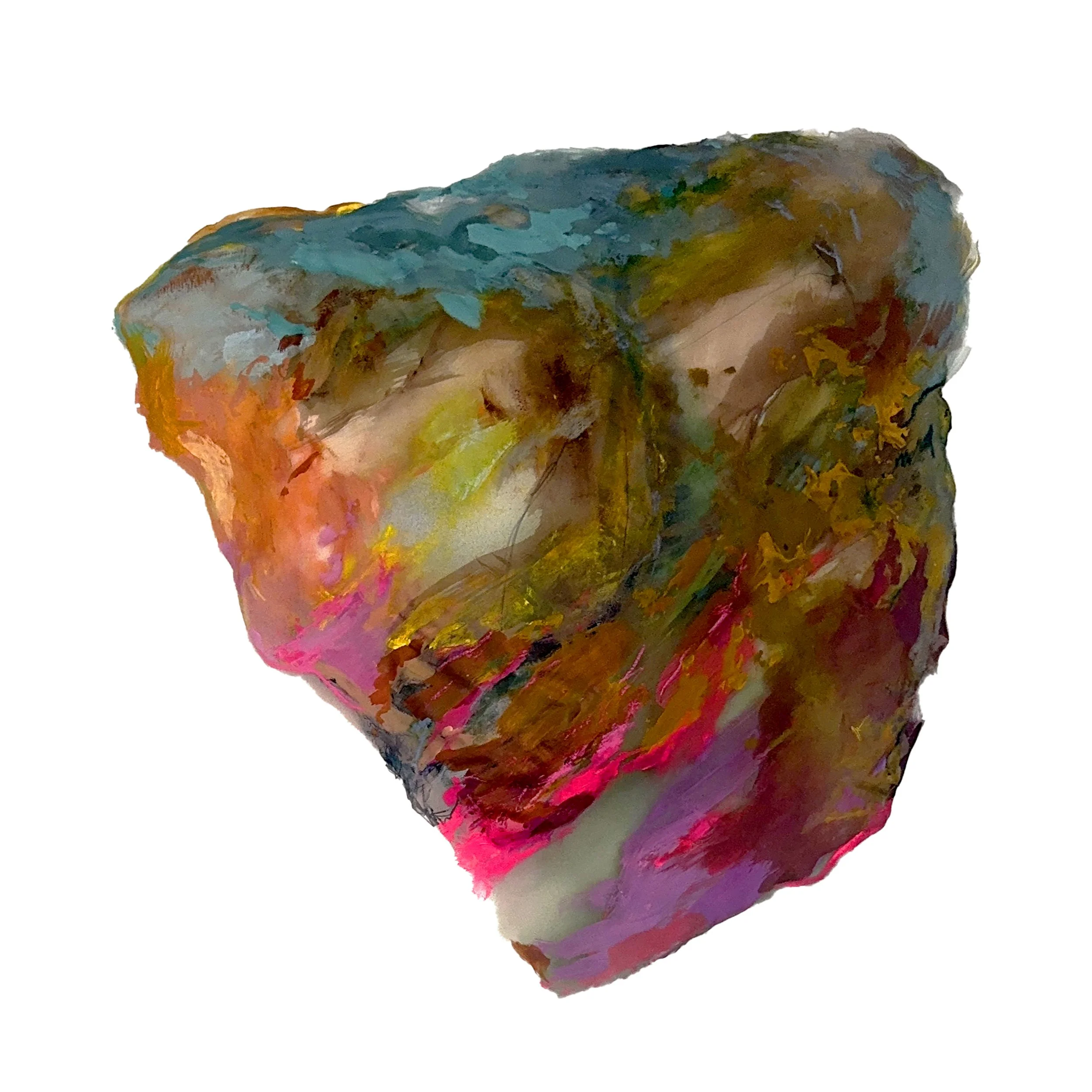 Drawing inspiration from glacial erratics—boulders transported across landscapes by glaciers or volcanic eruptions—Cupino reimagines these geological wanderers as metaphors for human experience. With shimmering silk chiffon paintings, sculptures crafted from recycled plastics, and innovative materials that blur the line between natural and manmade, her work challenges us to see beauty in transformation and chaos.